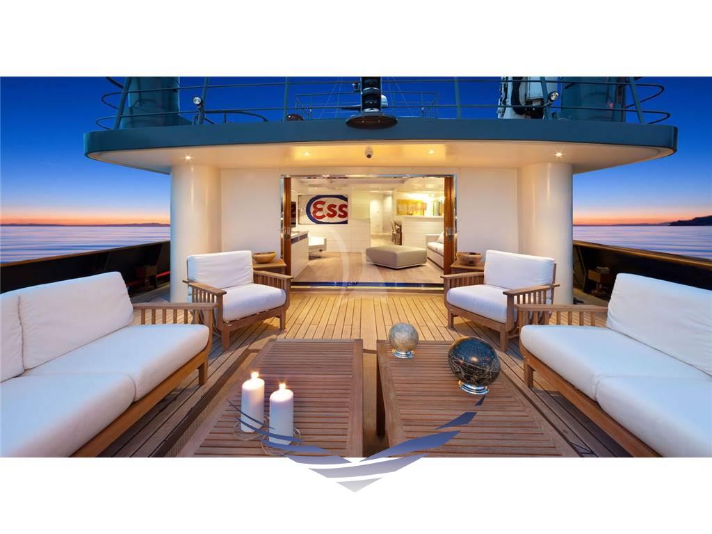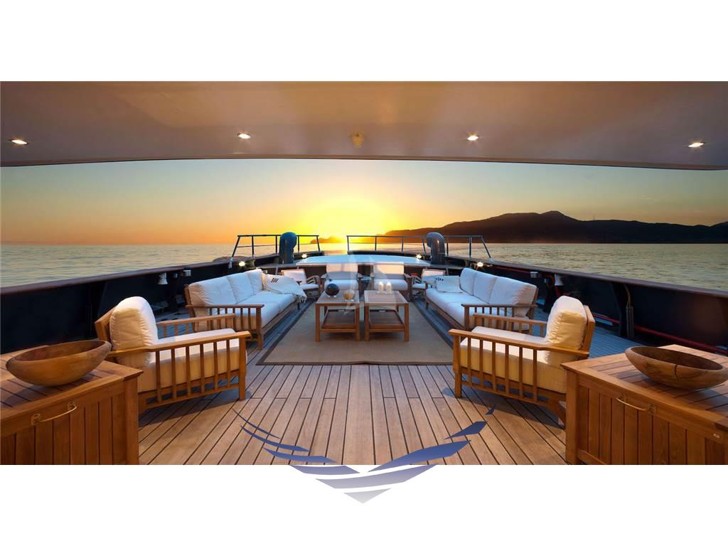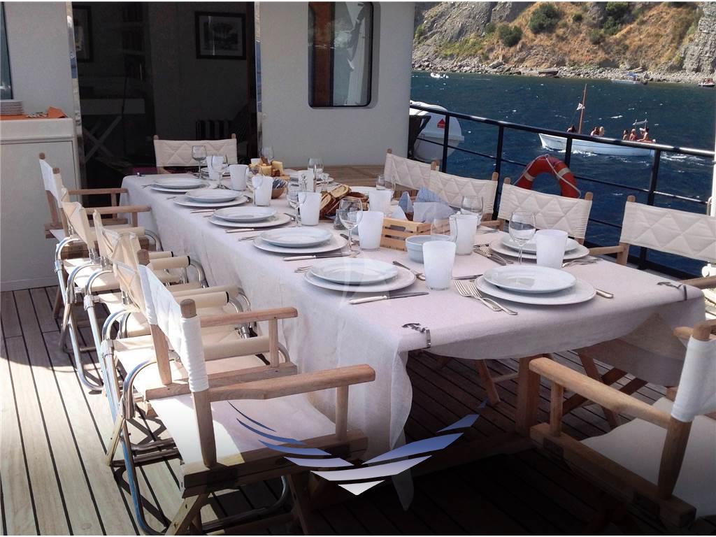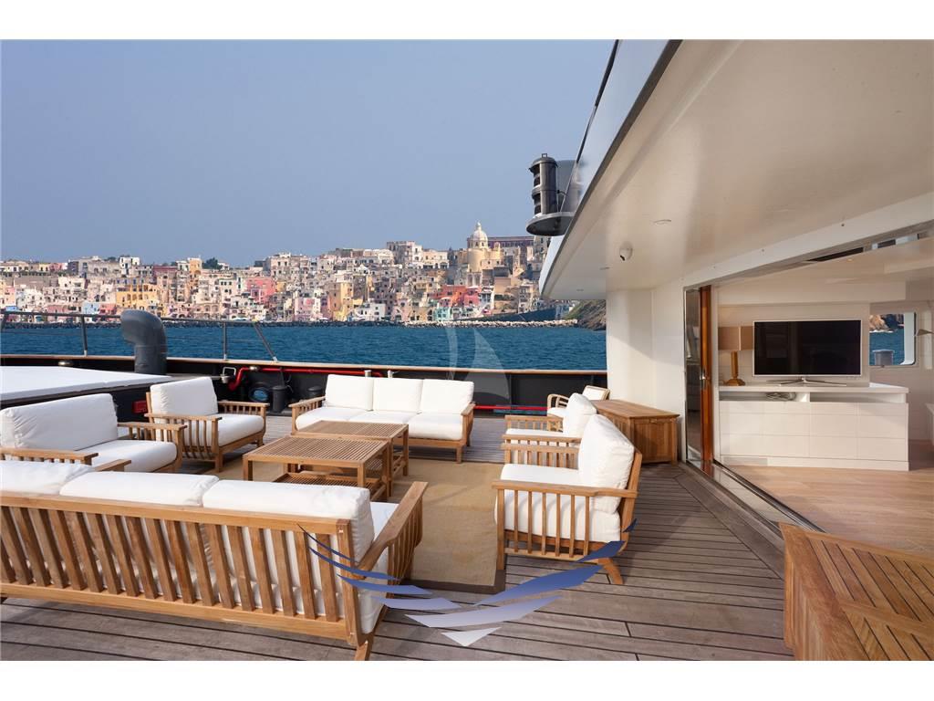 Il ponte superiore ospita una suggestiva zona relax adiacente alla plancia di comando, dotata di scrivania, libreria e un comodo divano, ideale per momenti di lettura o lavoro in totale tranquillità. All’esterno è presente un’area aperta, parzialmente coperta da tendalini, con tavolo per pranzi all’aperto e sedute prendisole.